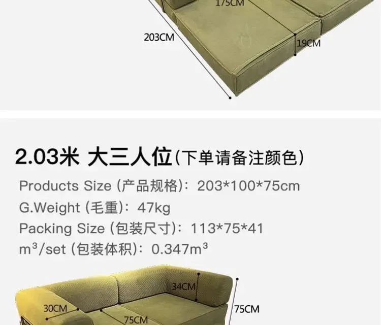 - Large three - seater: Product size 203*100*75cm (about 79.9*39.4*29.5 inches), gross weight 47kg, packing size 113*75*41cm, packing volume 0.347m³