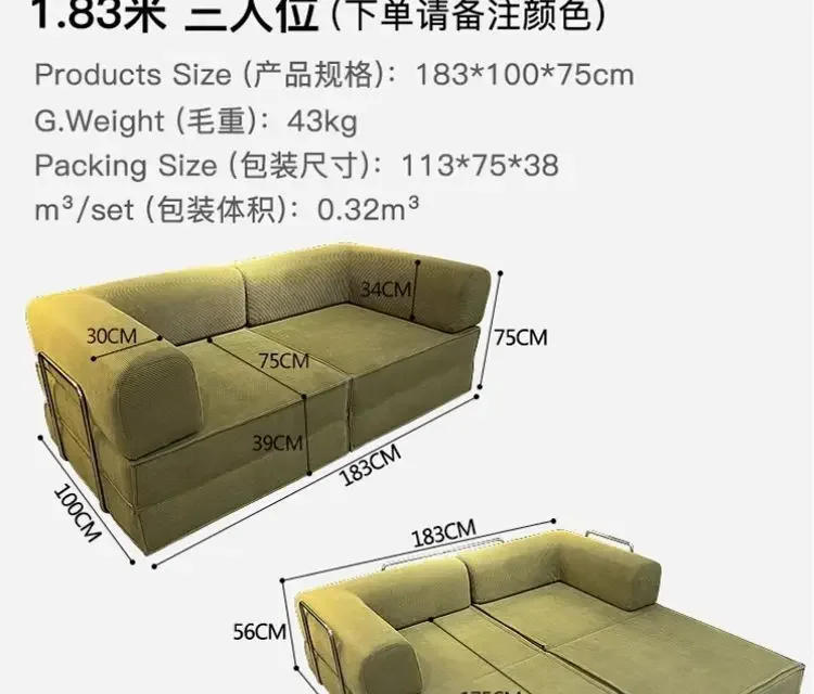 - Three - seater: Product size 183*100*75cm (about 72.0*39.4*29.5 inches), gross weight 43kg, packing size 113*75*38cm, packing volume 0.32m³